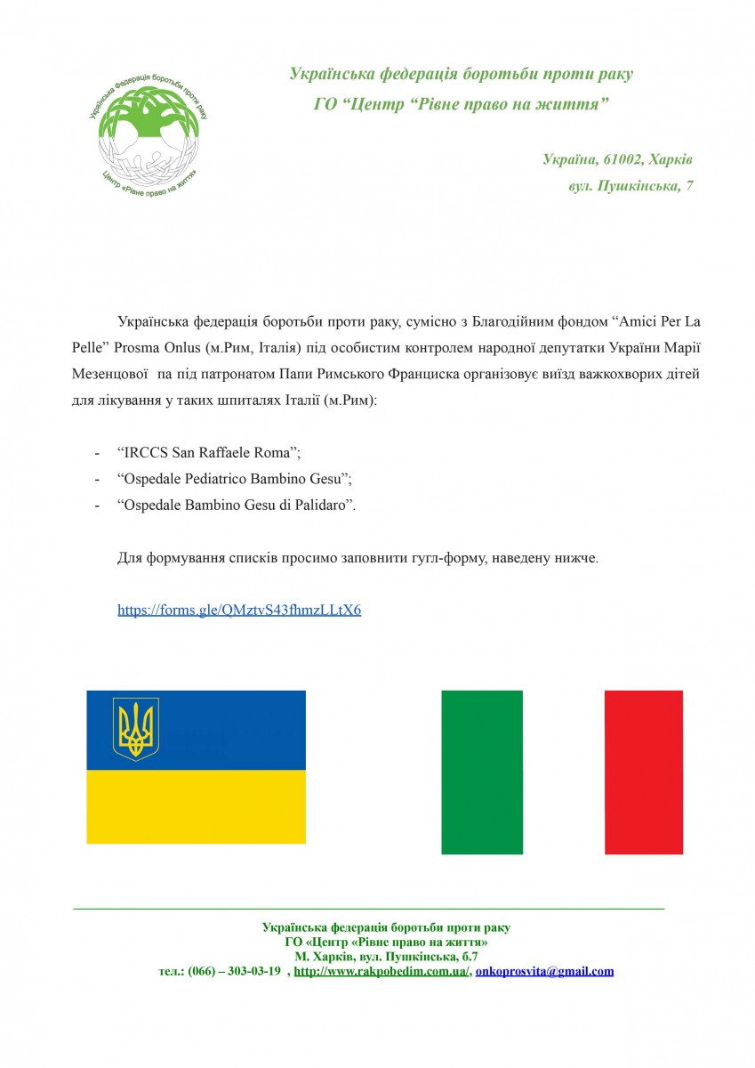 Виїзд важкохворих дітей (у супроводі з одним з батьків) для лікування у шпиталях Італії.